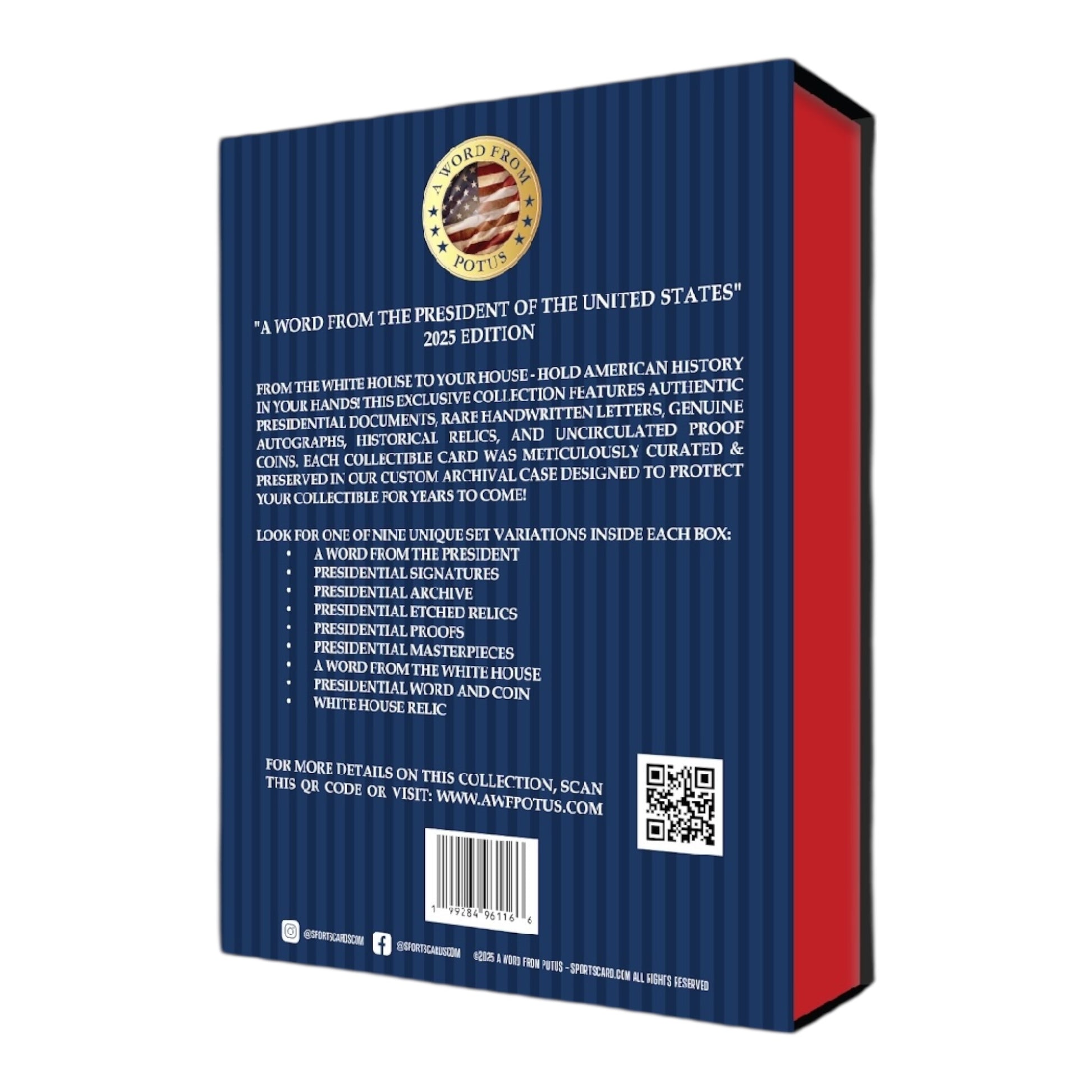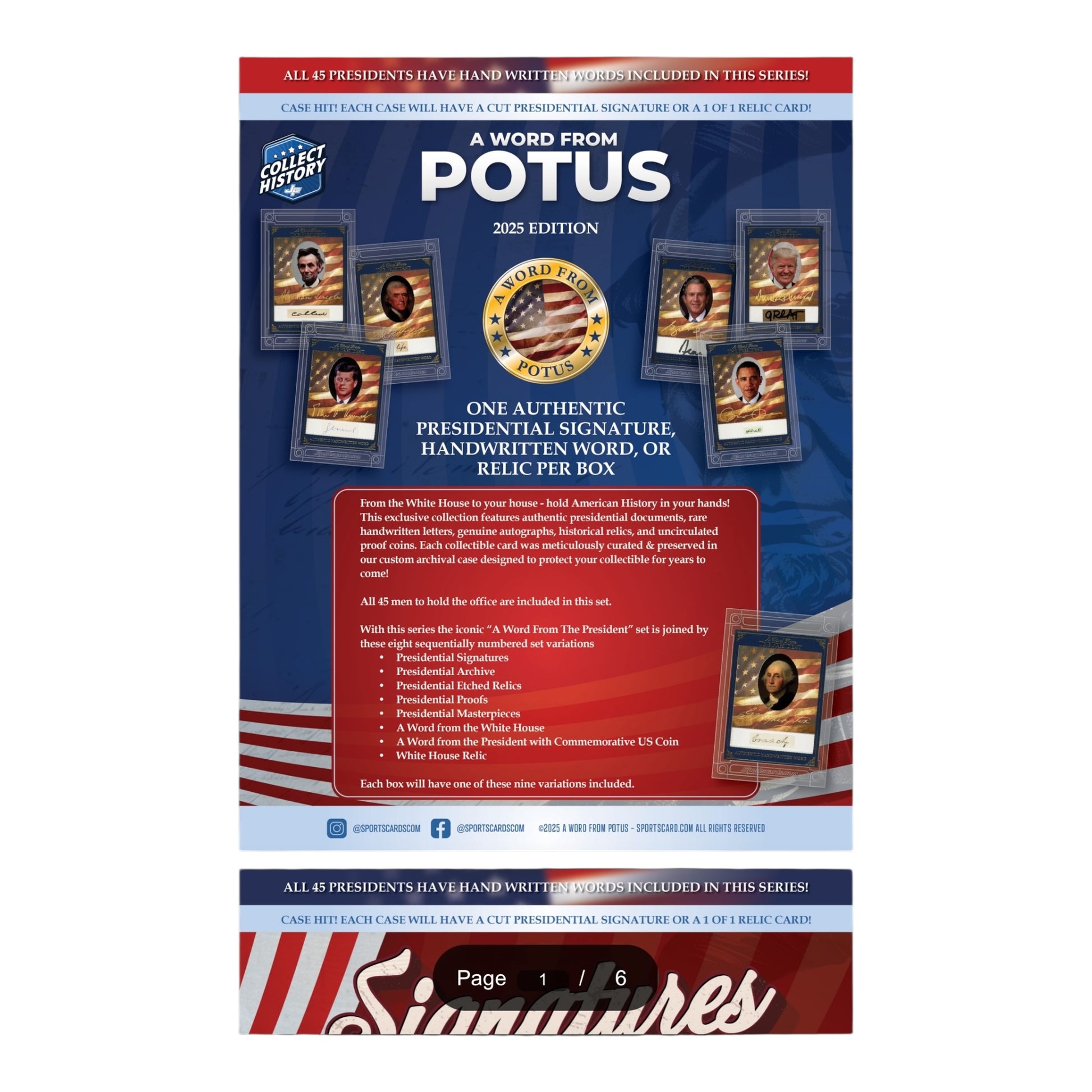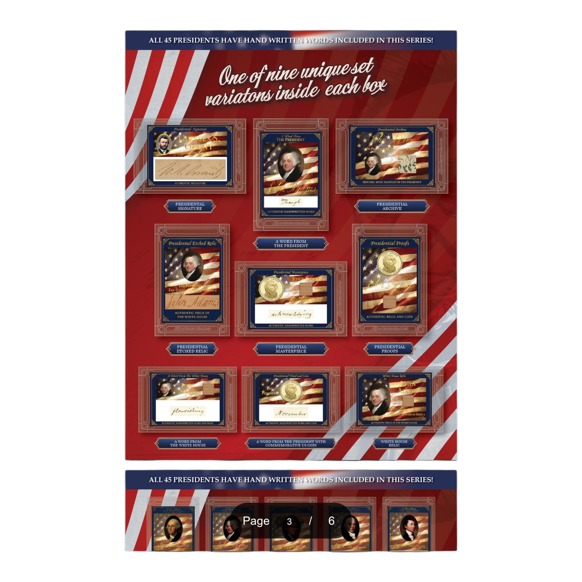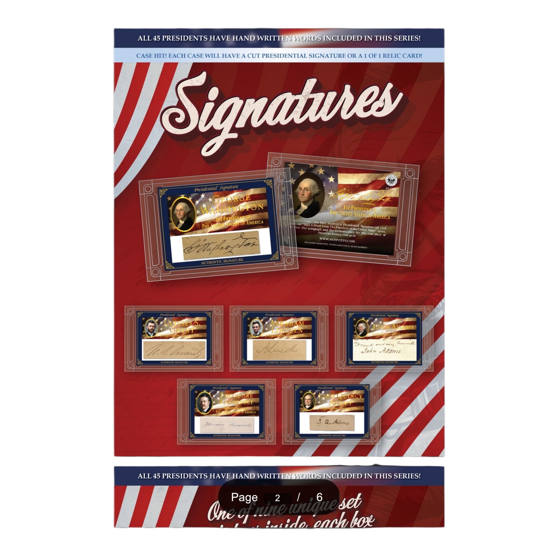 From the White House to your house - hold American History in your hands! This exclusive collection features authentic presidential documents, rare handwritten letters, genuine autographs, historical relics, and uncirculated proof coins. Each collectible card was meticulously curated & preserved in our custom archival case designed to protect your collectible for years to come!